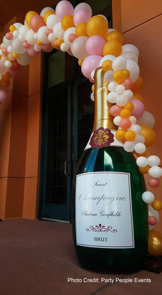 Our 6ft inflatable champagne bottles certainly make an impact and they are easy to inflate and easy to use. Clients have sent us some fantastic photos, showing them off in their decorations for parties, weddings, christenings, birthdays… or almost any other kind of celebration you can think of. As you can see from the gallery, they look absolutely stunning when you add a balloon arch to represent a spray of bubbles.